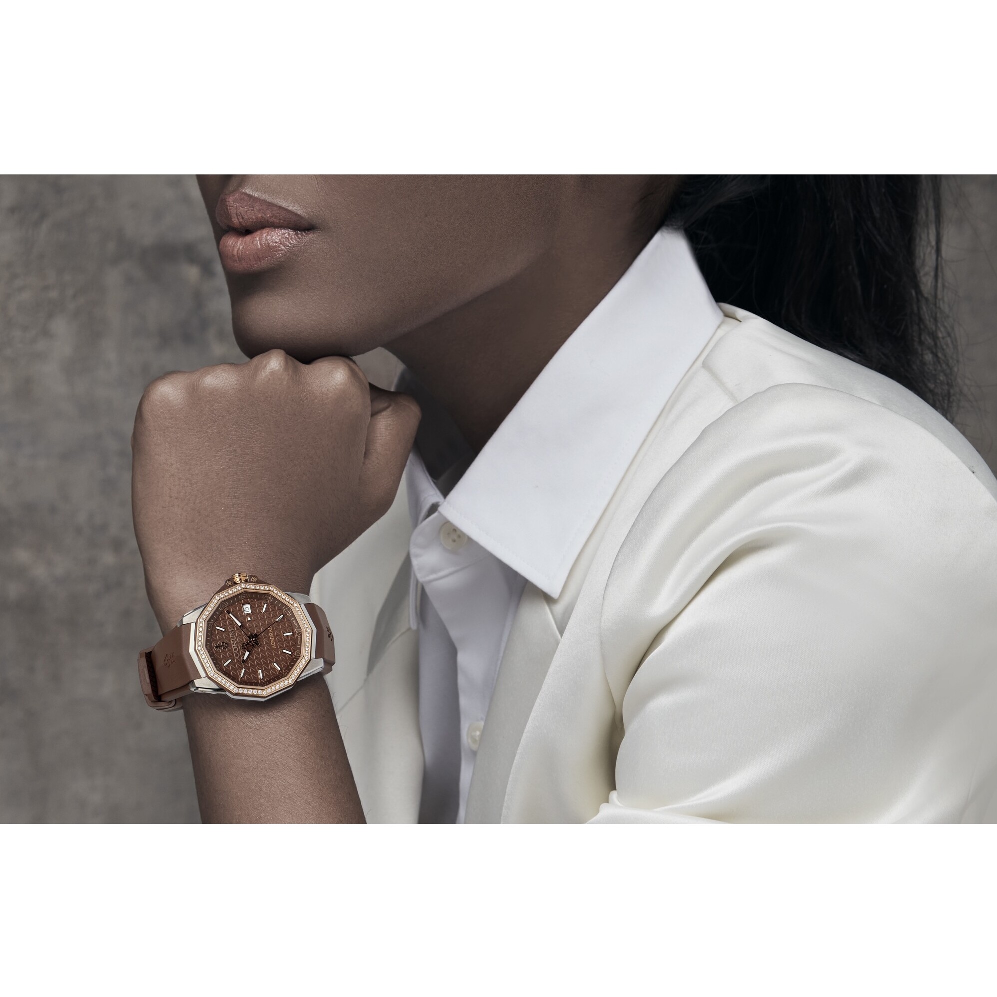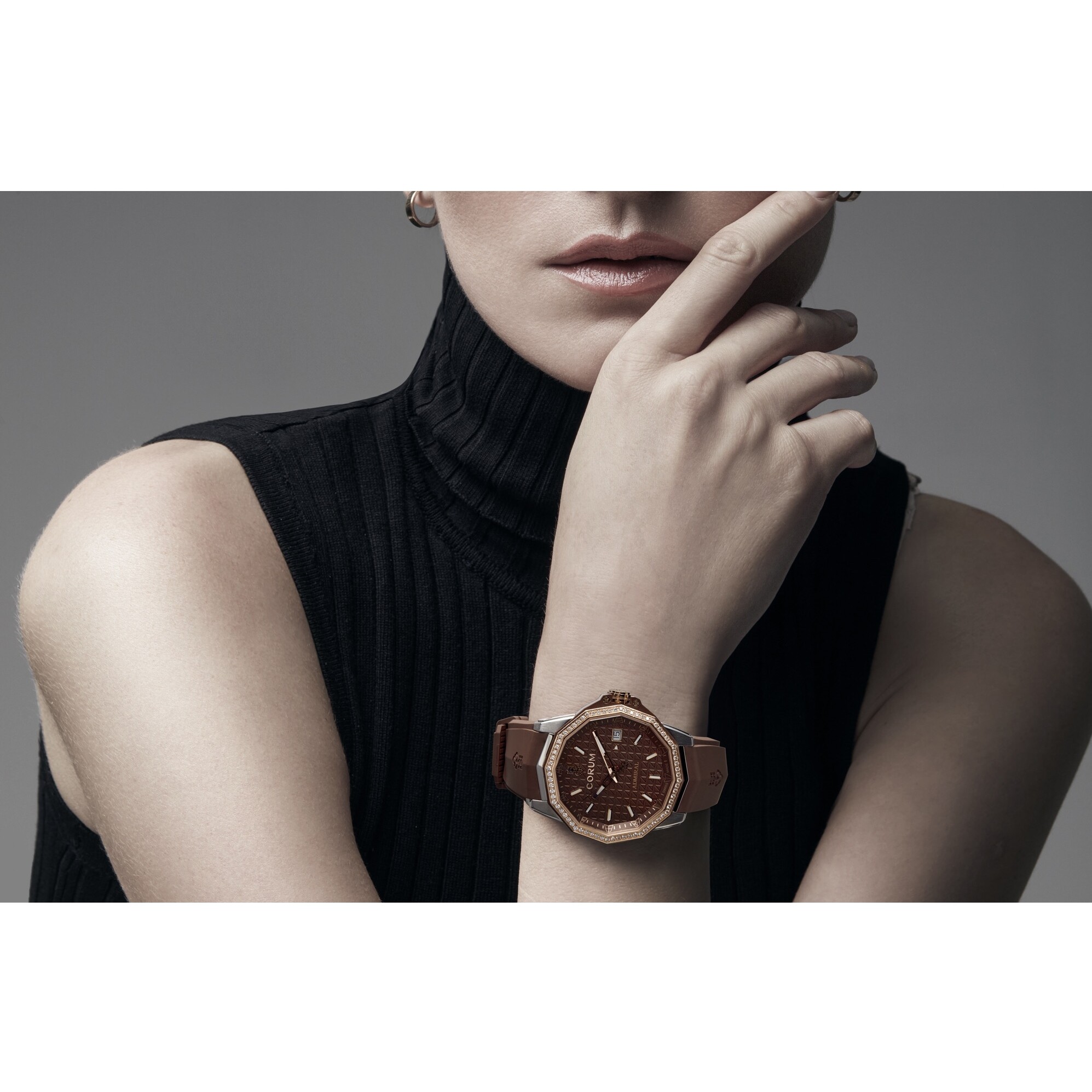 The 38 mm stainless-steel case is crowned with a stunning diamond-set 18K rose-gold bezel, adding brilliance and sophistication while preserving the iconic dodecagonal shape. Paired with a matching brown rubber strap embossed with the Corum emblem, the watch blends sport chic comfort with jewellery-level elegance.