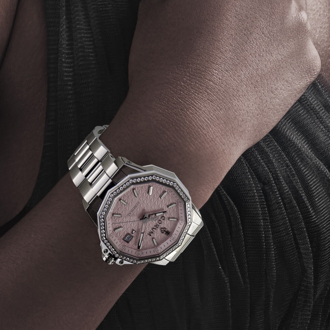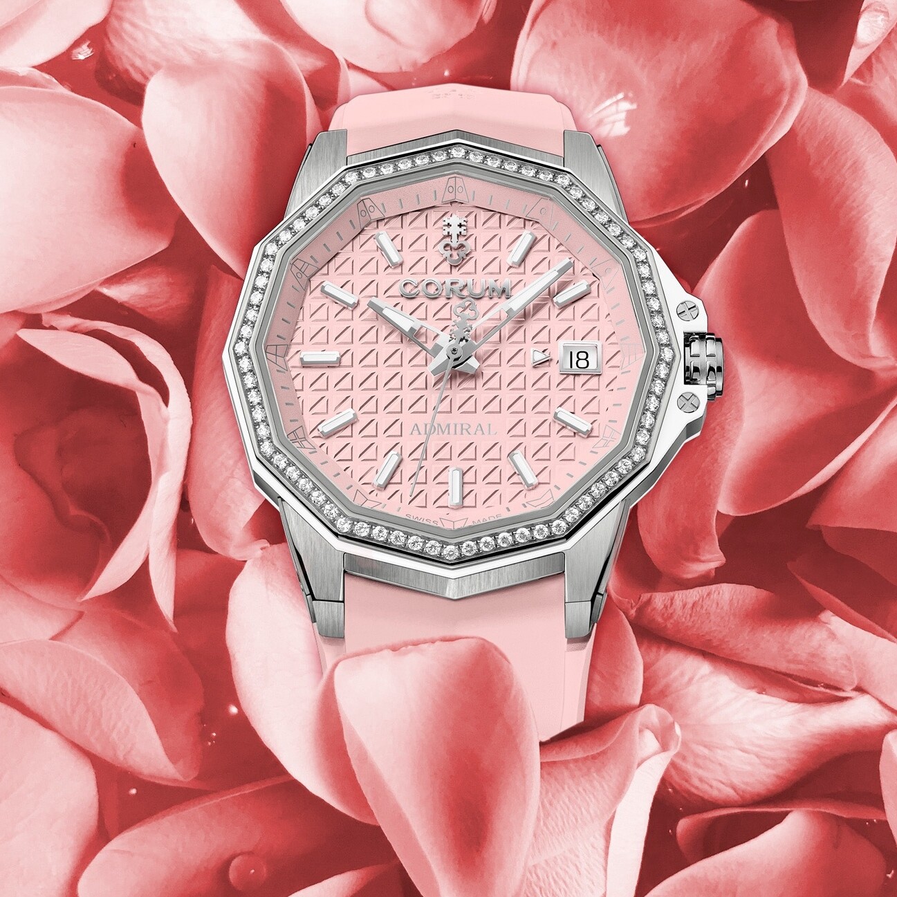 Fresh, elegant, and distinctly modern, the Admiral 38 with its pink dial brings a refined contemporary twist to Corum’s iconic nautical design. The soft rose-pink hue gives the watch a feminine yet sophisticated character, beautifully contrasted by the colourful nautical pennant hour markers that define the Admiral collection.