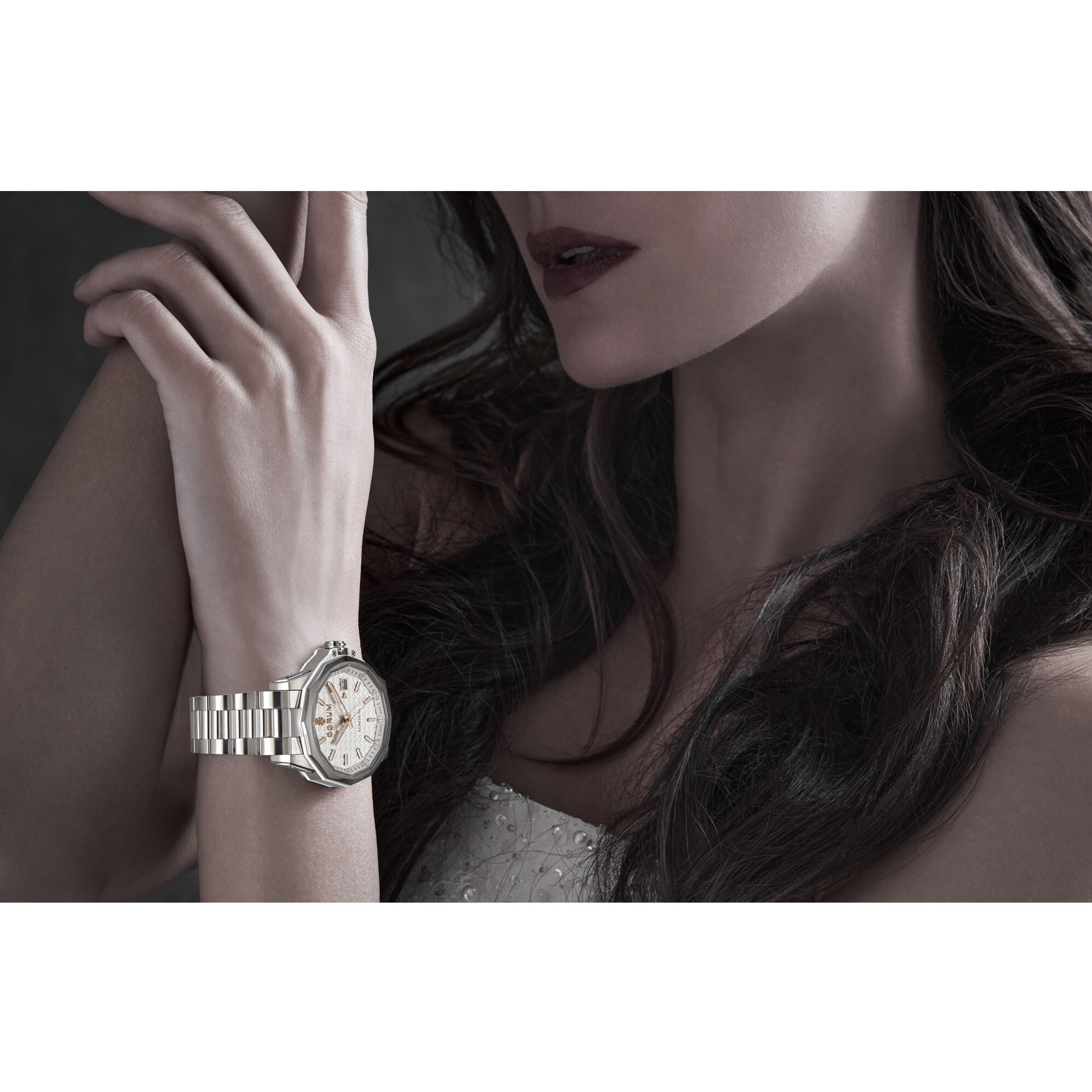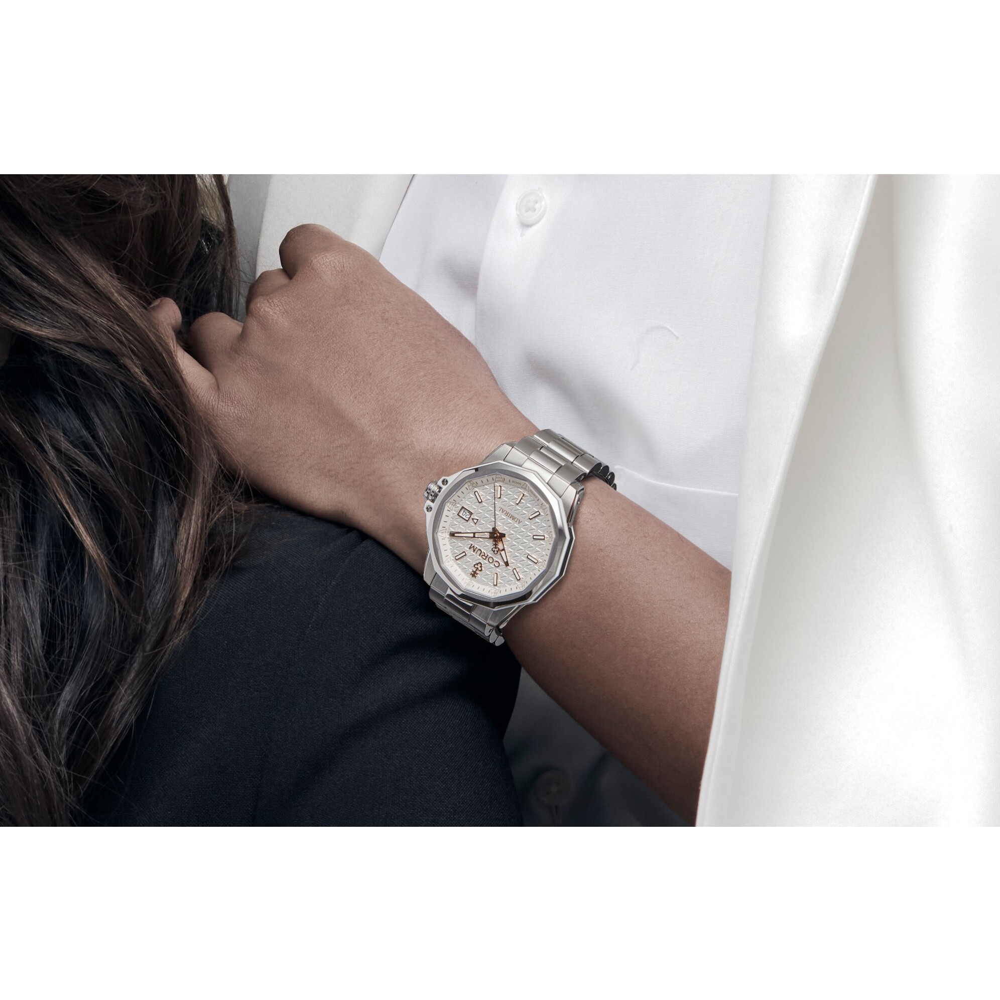 The polished stainless-steel dodecagonal case and matching steel bracelet offer a harmonious, contemporary look, while the reduced size ensures exceptional comfort on any wrist. A framed date window at 3 o’clock completes the design, adding everyday practicality to its clean aesthetic.