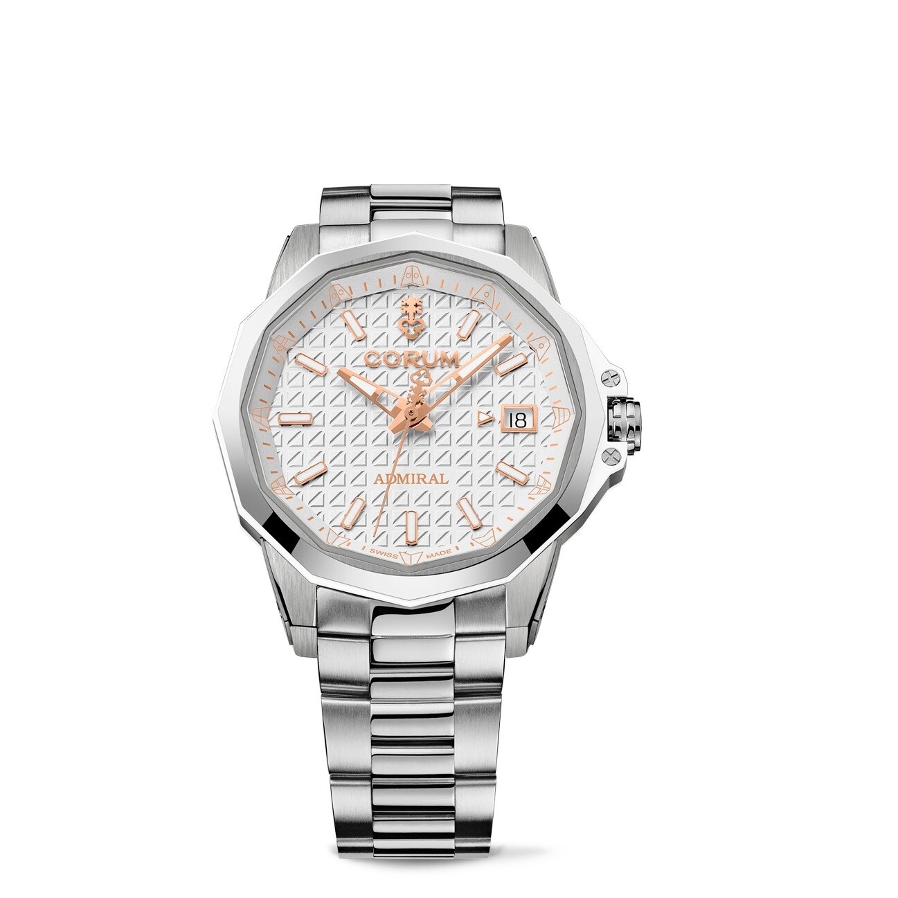 Elegant, modern, and effortlessly versatile, the Admiral 38 Automatic brings Corum’s nautical DNA into a refined 38 mm format — perfectly sized for a sleek unisex fit. The crisp white dial features Corum’s signature embossed Admiral pattern, adding subtle depth and texture. Rose-gold toned hands, indices, and logo create a refined contrast, giving the watch a warm, luxurious character without overpowering the design.