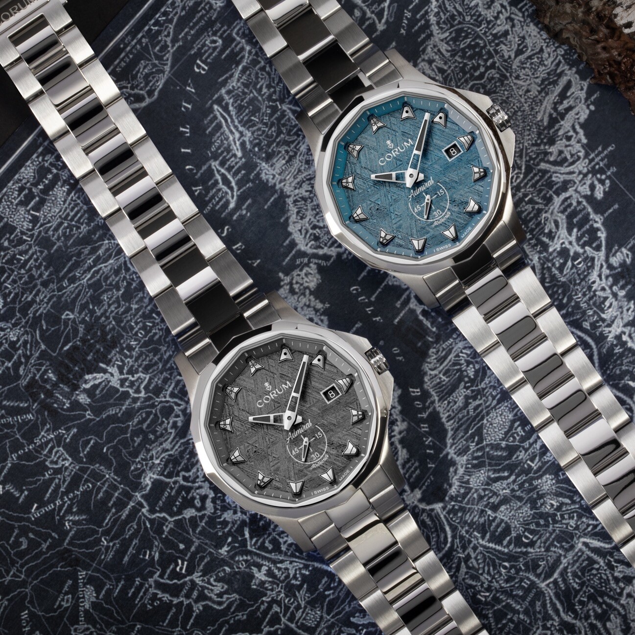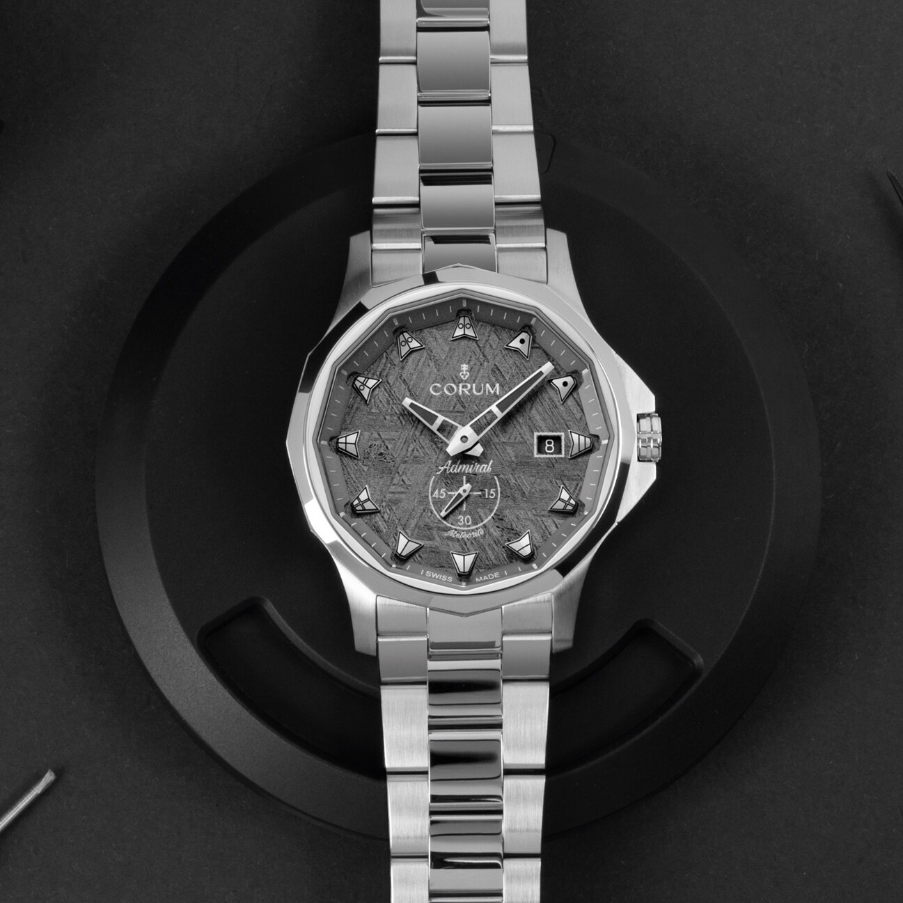 The Admiral 42 Automatic brings a contemporary, technical edge to Corum’s iconic nautical design. Its striking anthracite grey dial features a unique meteorite-style texture and the signature twelve nautical pennant hour markers, giving the watch a bold and distinctive presence. Housed in a 42 mm stainless-steel dodecagonal case and paired with a matching steel bracelet, the model blends sportiness with refined luxury.