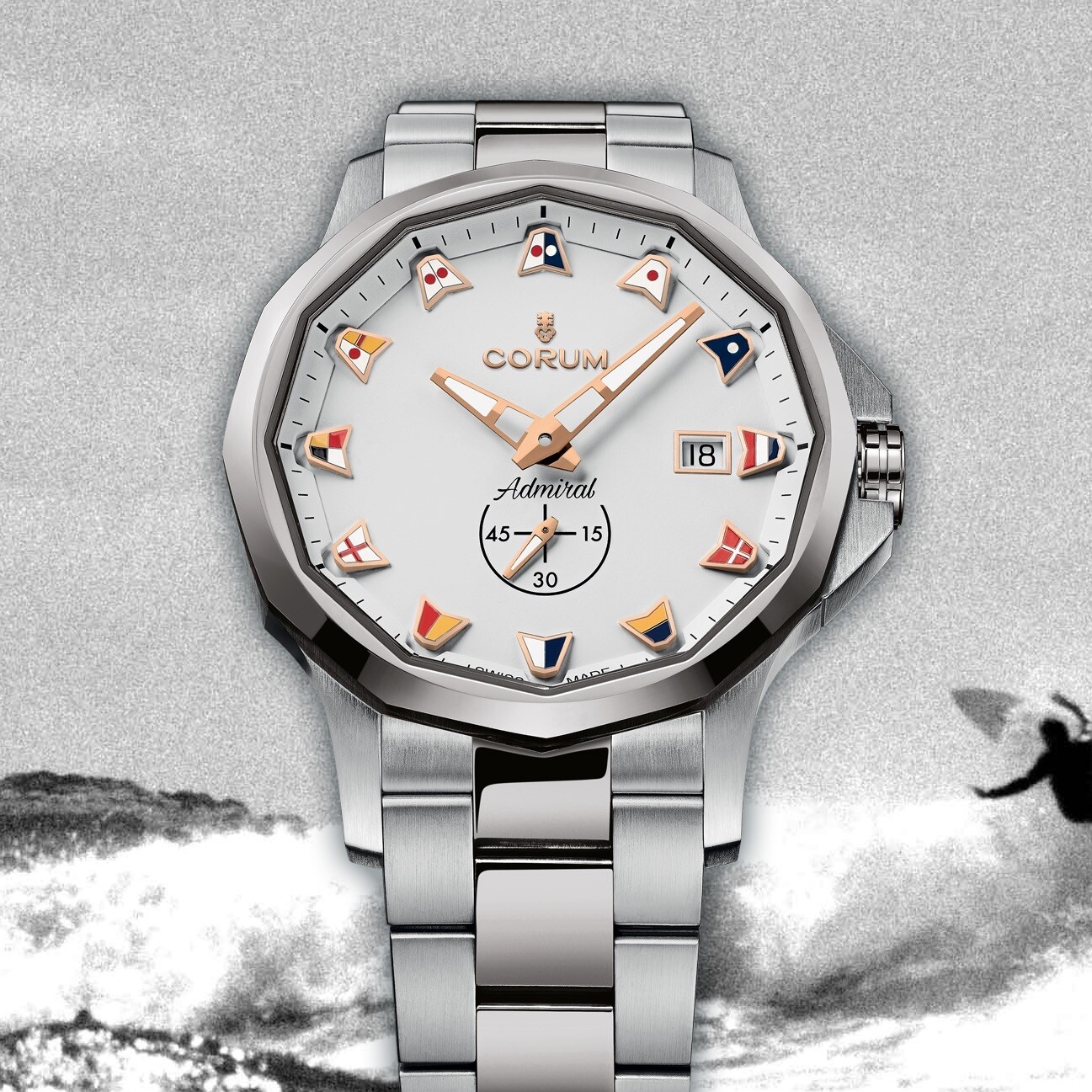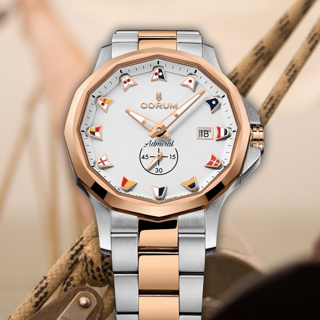 Sporty elegance meets unmistakable nautical heritage. The Admiral 42 Automatic Ref. A395/04247 features a sleek 42 mm stainless-steel case paired with a matching steel bracelet, offering a modern and versatile presence on the wrist. Its crisp white dial is enhanced by Corum’s signature coloured pennant hour markers and a refined geometric texture that adds depth without overwhelming the design.