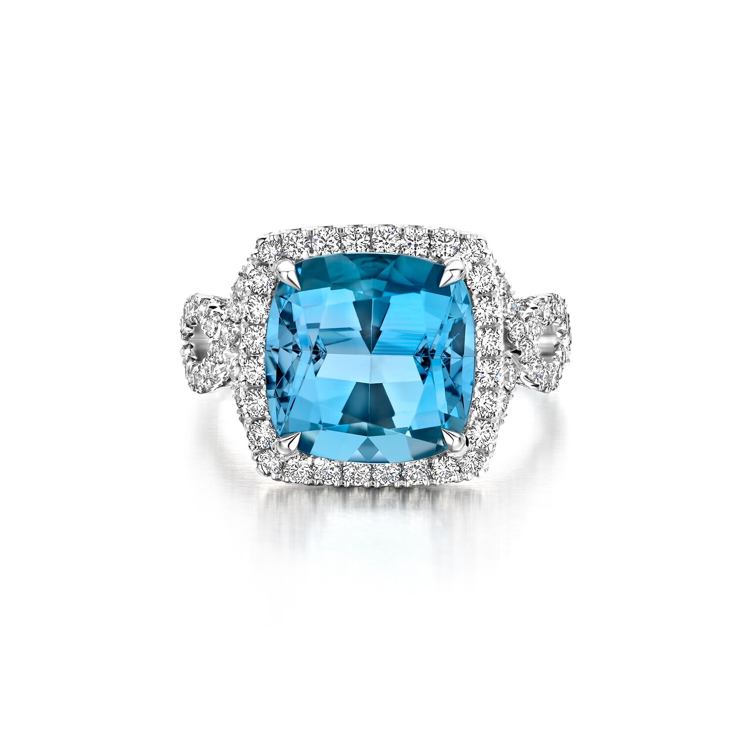 A vived cushion-cut aquamarine framed by a sparkling diamond halo, set on a sleek 18Kt white gold band. Timeless, bright, and effortlessly elegant.