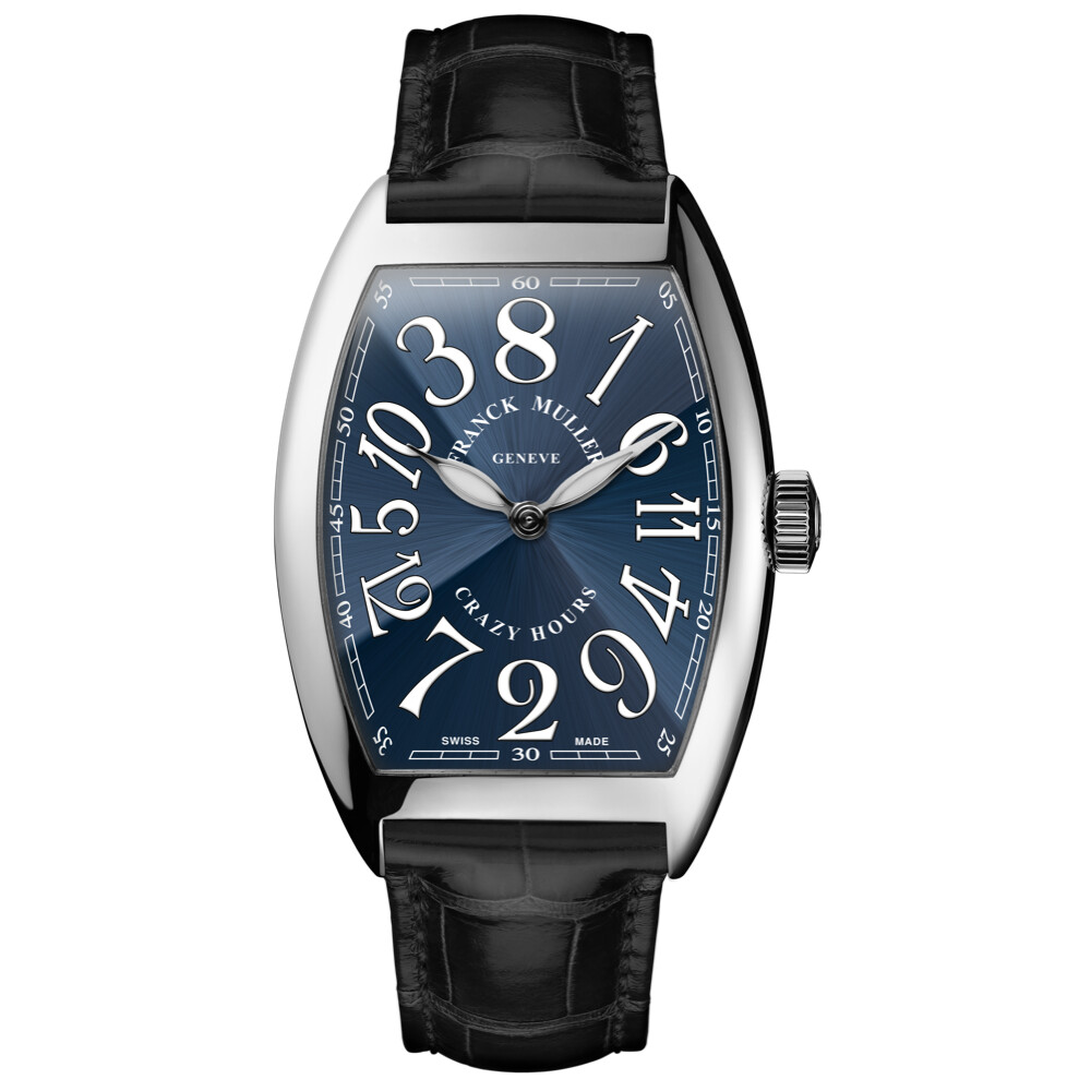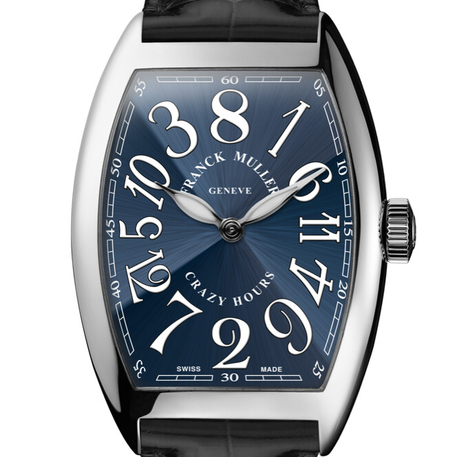 A captivating twist on time, this steel Crazy Hours II features a deep blue sunray dial with numerals arranged in Franck Muller’s signature unpredictable sequence. Paired with a black alligator strap, it blends playful complication with refined Swiss elegance.