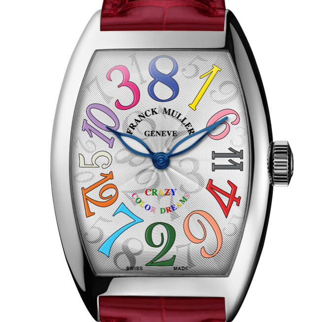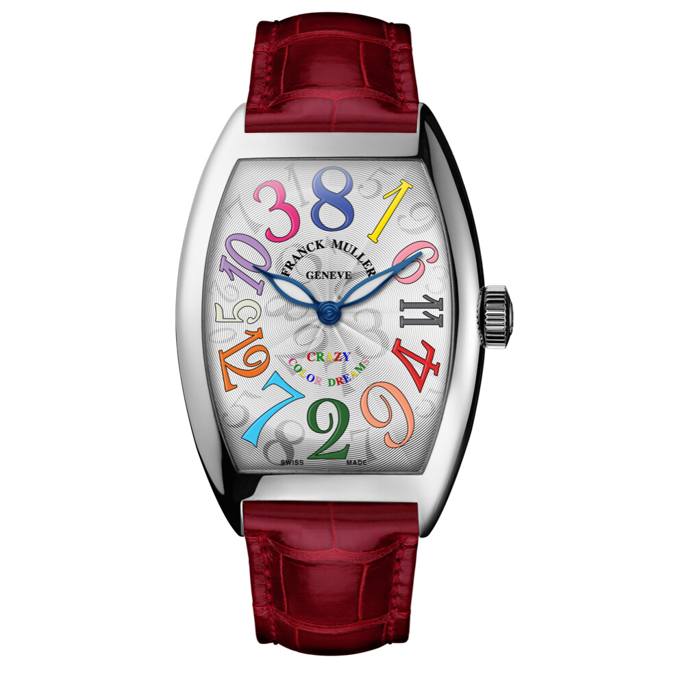 A vibrant take on the iconic Curvex shape, this steel Crazy Color Dreams model features a silver guilloché dial with multicolored numerals and elegant blued hands. Finished with a red alligator strap, it brings playful energy to timeless Swiss craftsmanship.