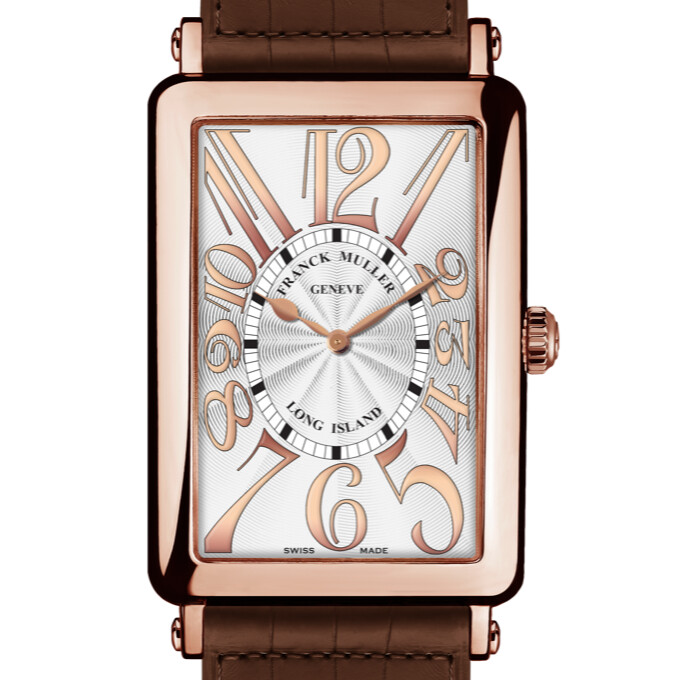 Timeless and refined, the Long Island in rose gold features a silver guilloché dial with elongated Art Deco numerals and delicate rose-gold hands. Paired with a brown alligator strap, it embodies classic elegance in Franck Muller’s iconic rectangular silhouette.