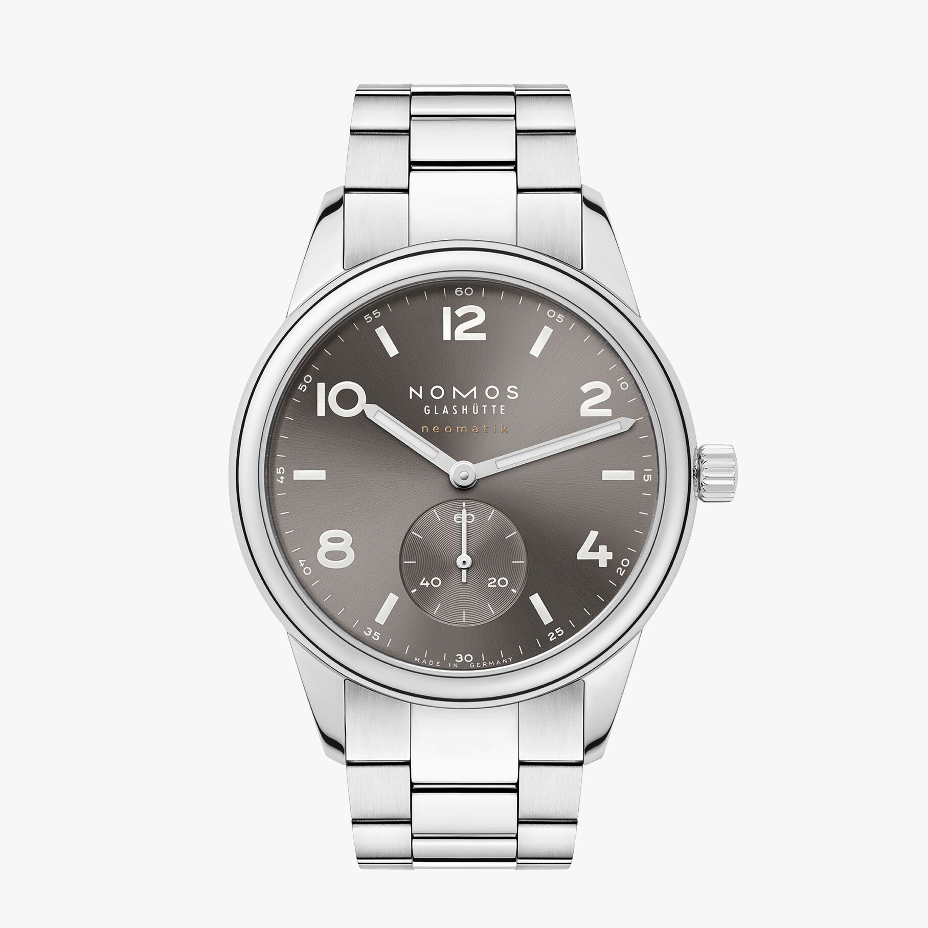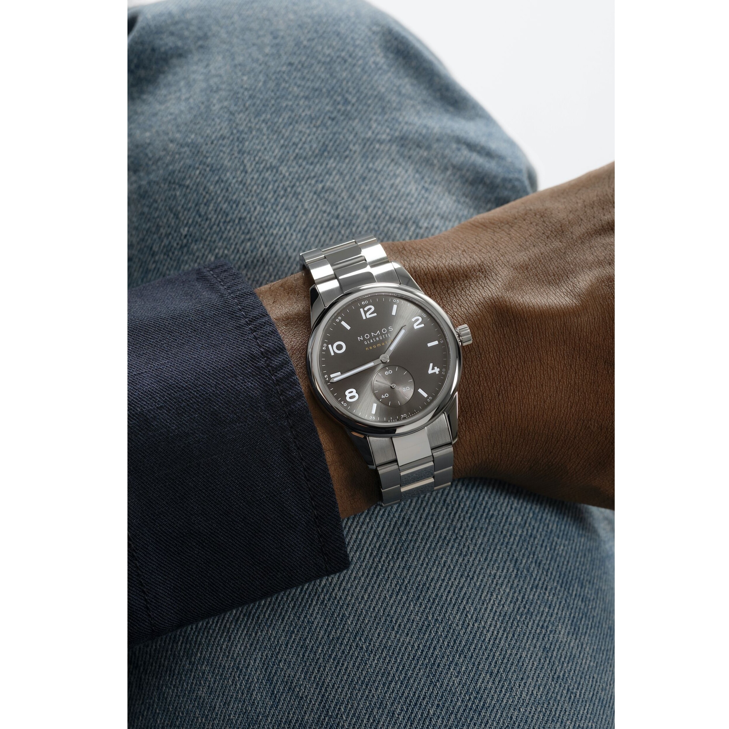 The sunburst polishing of the galvanized dial lets the smoky light gray tone glow richly—and with a great deal of character. This sporty NOMOS automatic watch represents style and connoisseurship. It adds luster without being overbearing. In a robust stainless steel case with a polished and satin-finished stainless steel link bracelet, Club Sport neomatik 39 smoke is water-resistant to 20 atm and, at the same time, unusually slim with a height of just 8.5 millimeters. Inside the automatic caliber DUW 3001 with a proprietary escapement, the NOMOS swing system, is at work.