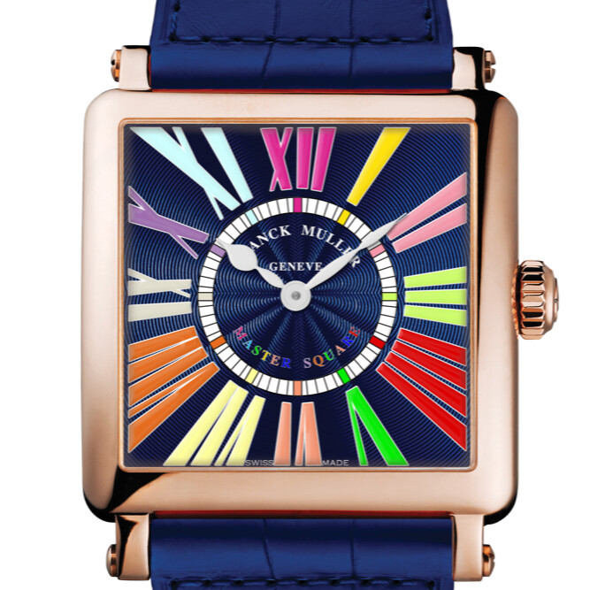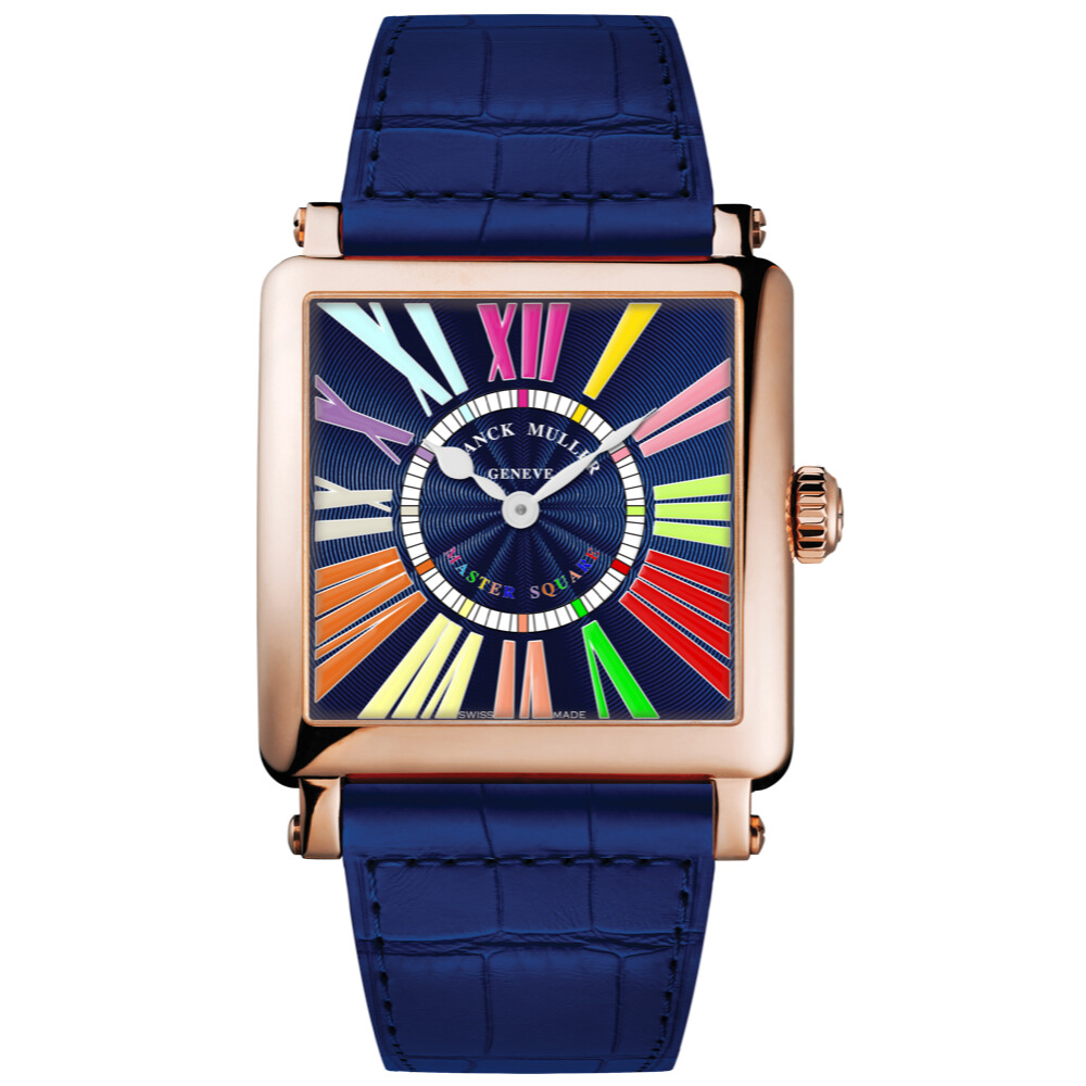 A bold celebration of color, the Franck Muller Master Square features a deep blue sunburst dial illuminated by multicolored Roman numerals. Its rose gold case adds warmth and elegance, while the matching blue alligator strap completes the striking look. A perfect blend of artistic flair and Swiss precision.