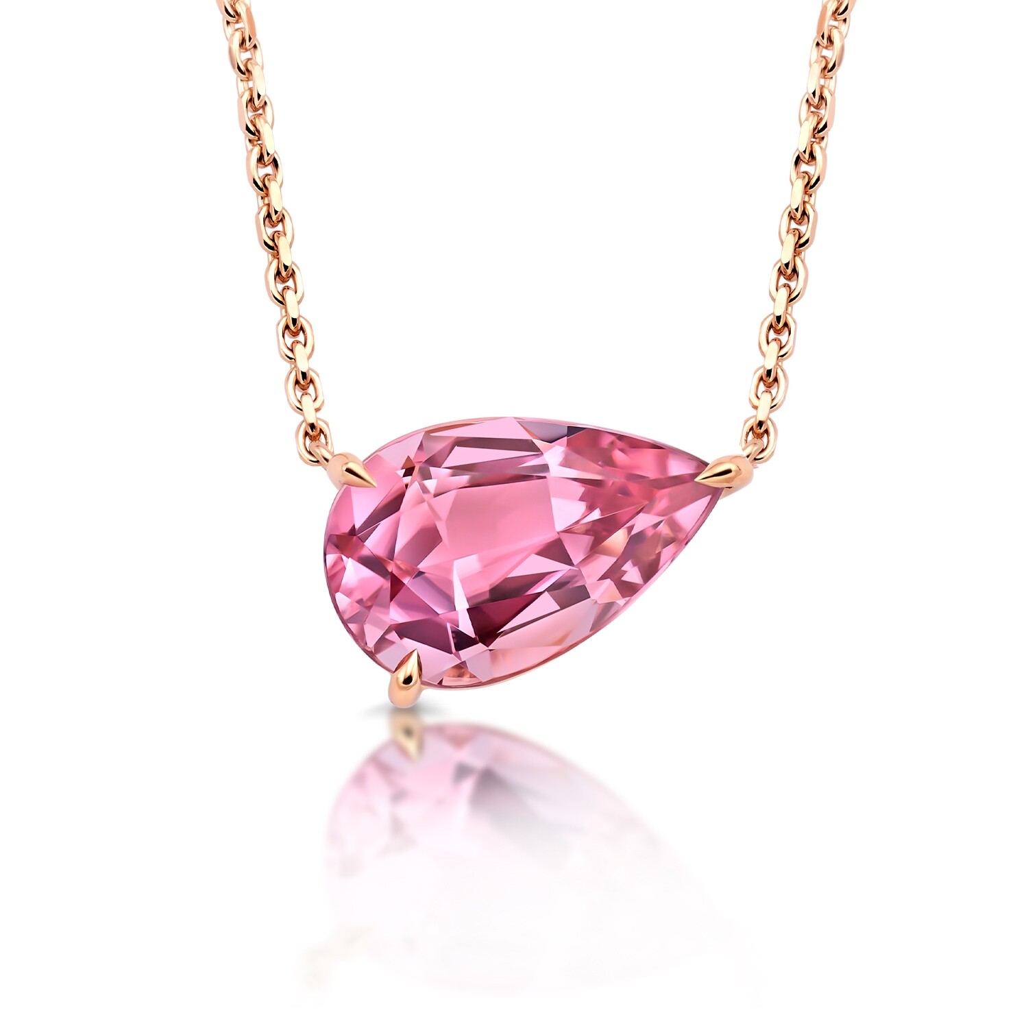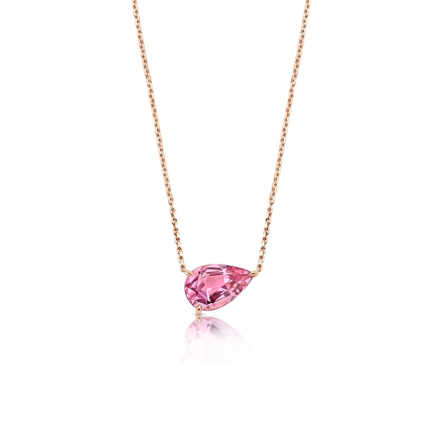 A delicate pear-cut pink tourmaline set on a refined 18Kt rose-gold chain. Playful, feminine, and effortlessly elegant for everyday wear.