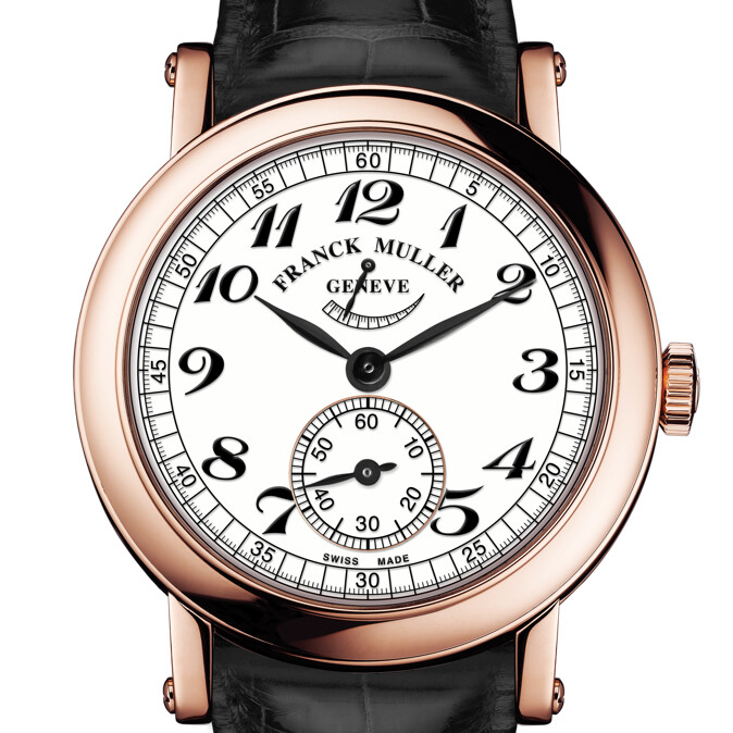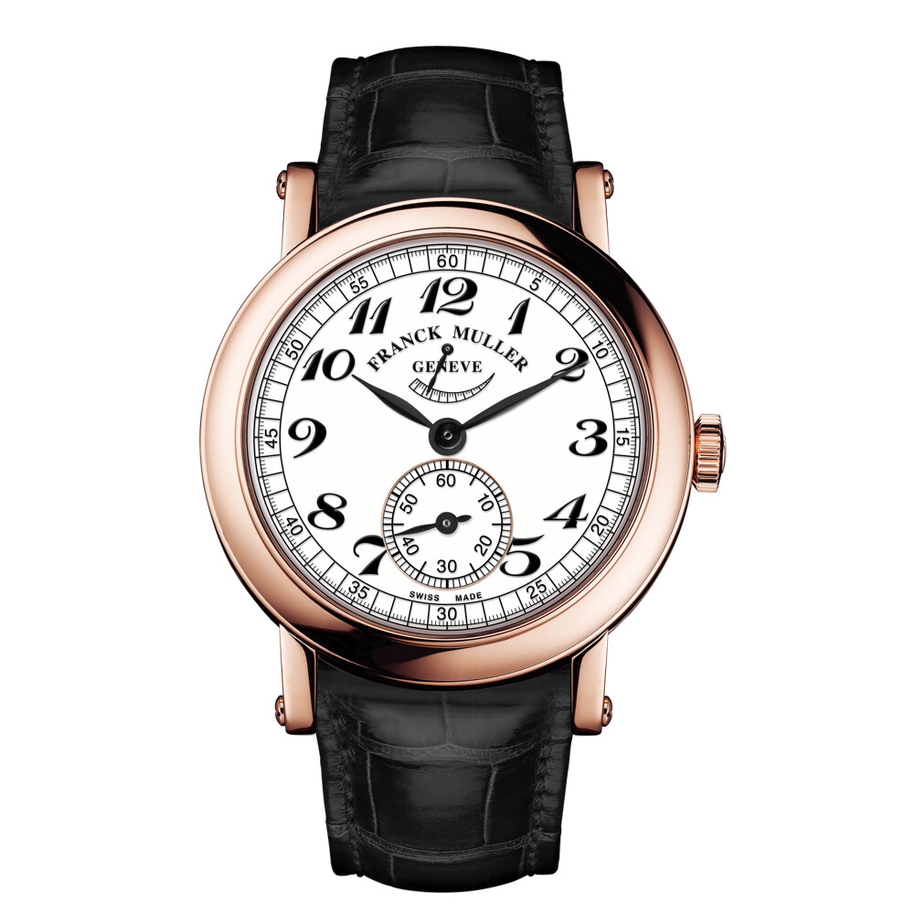 Classic and refined, this rose-gold Franck Muller Round features a crisp white dial with vintage-inspired numerals, blued hands, and a small-seconds counter at 6 o’clock. Paired with a black alligator strap, it offers timeless elegance with a traditional Swiss aesthetic.