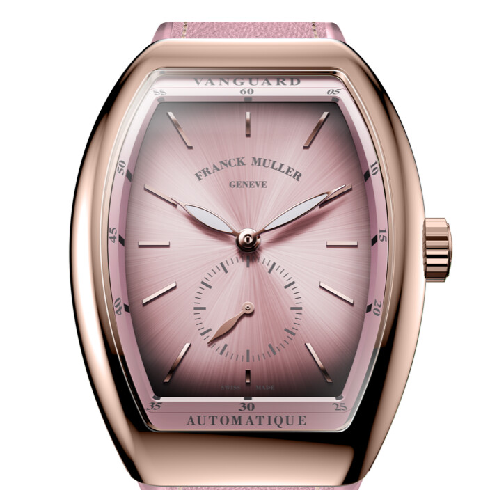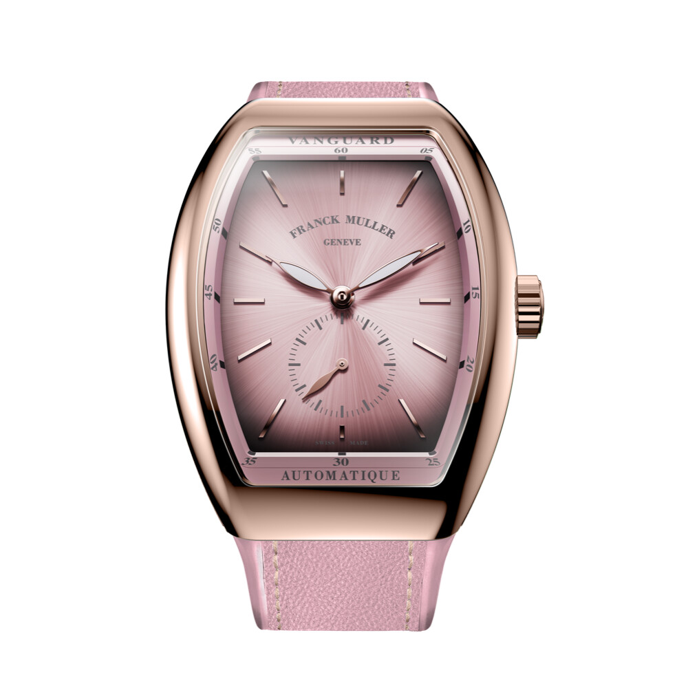 Refined and feminine, the Vanguard Lady in rose gold features a soft pink sunray dial with sleek index markers and a small-seconds counter at 6 o’clock. Paired with a matching pink strap, it blends modern elegance with Franck Muller’s signature curved silhouette.