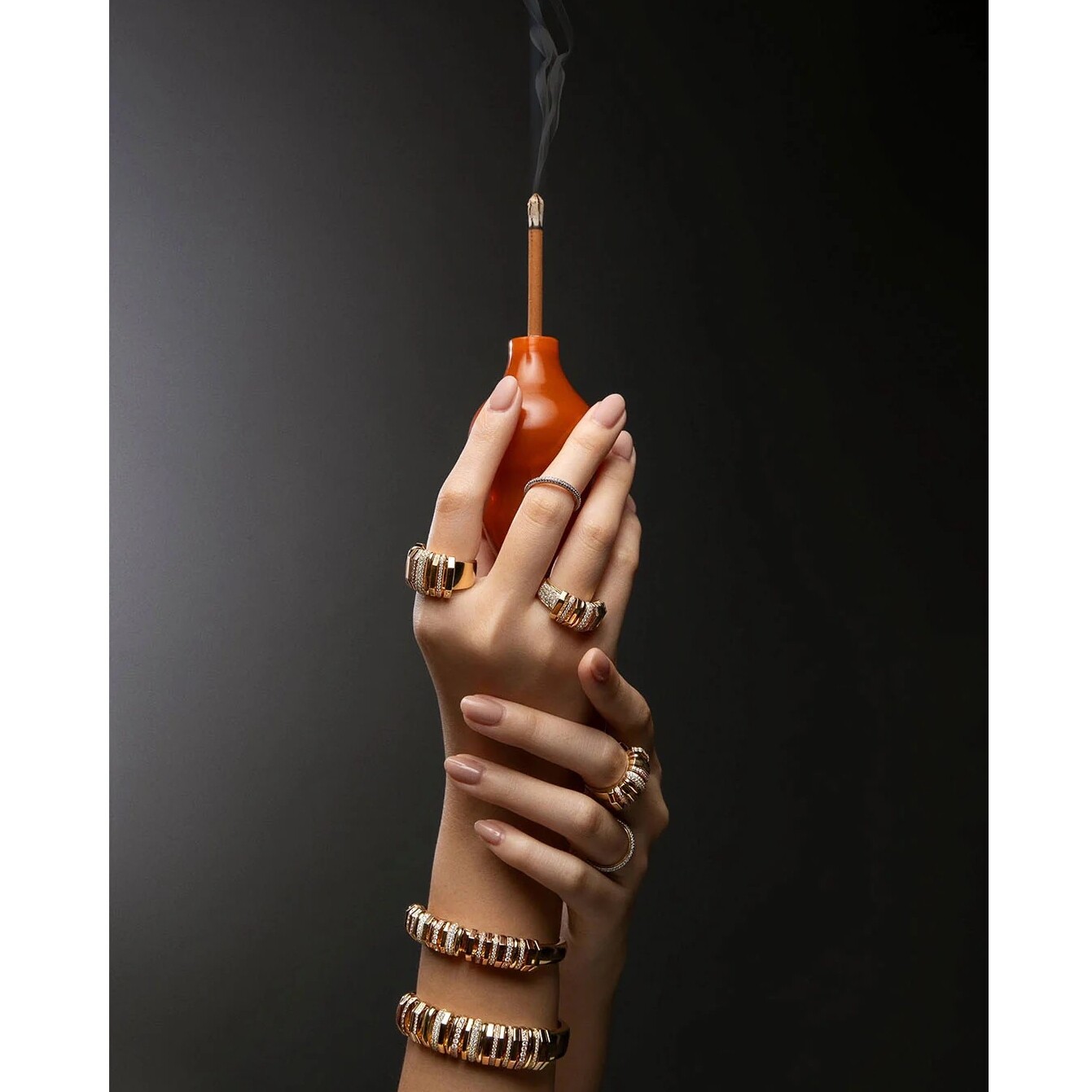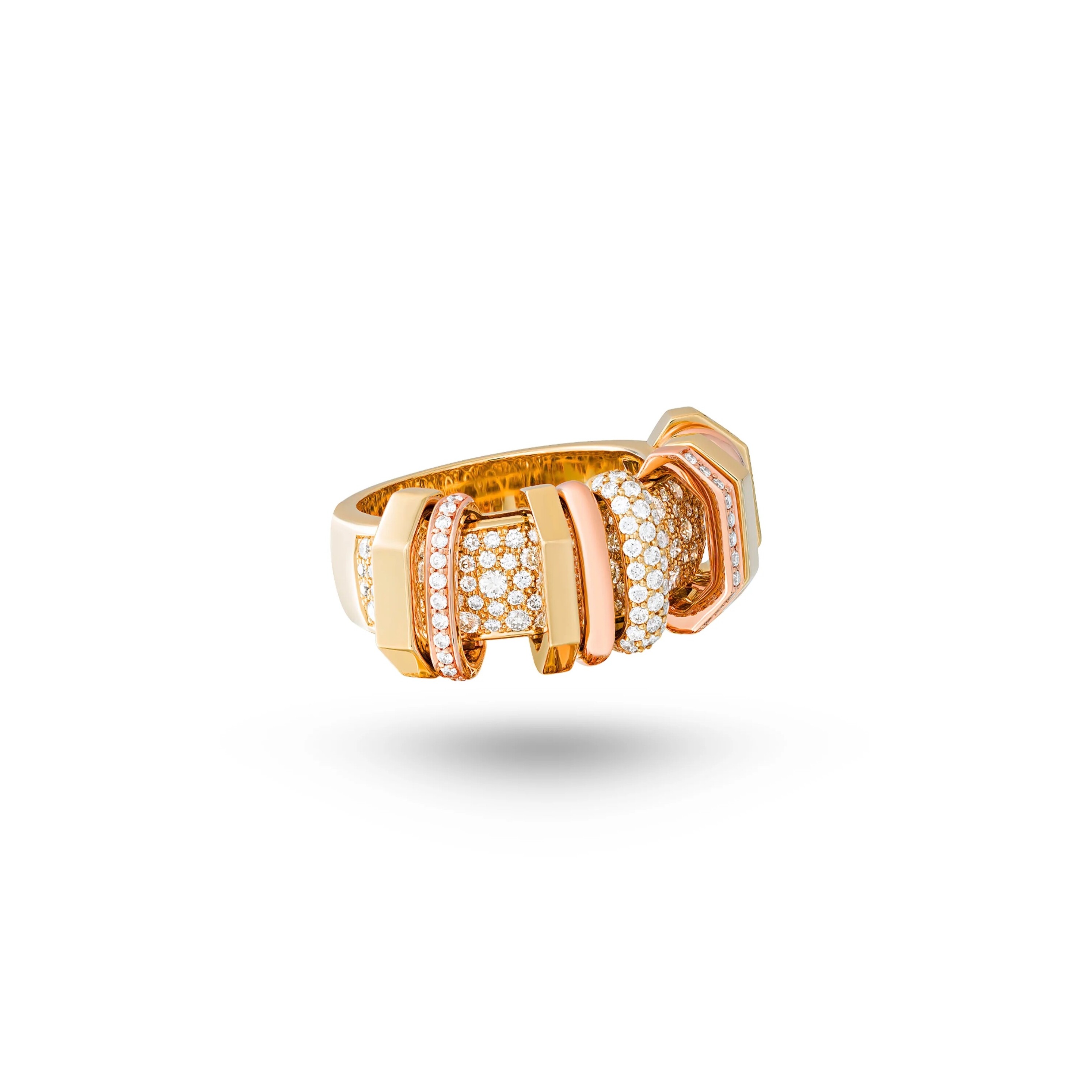 A playful mix of stacked geometric elements in yellow, rose, and white gold, accented with shimmering pavé diamonds. A bold, modern ring with sculptural sparkle.