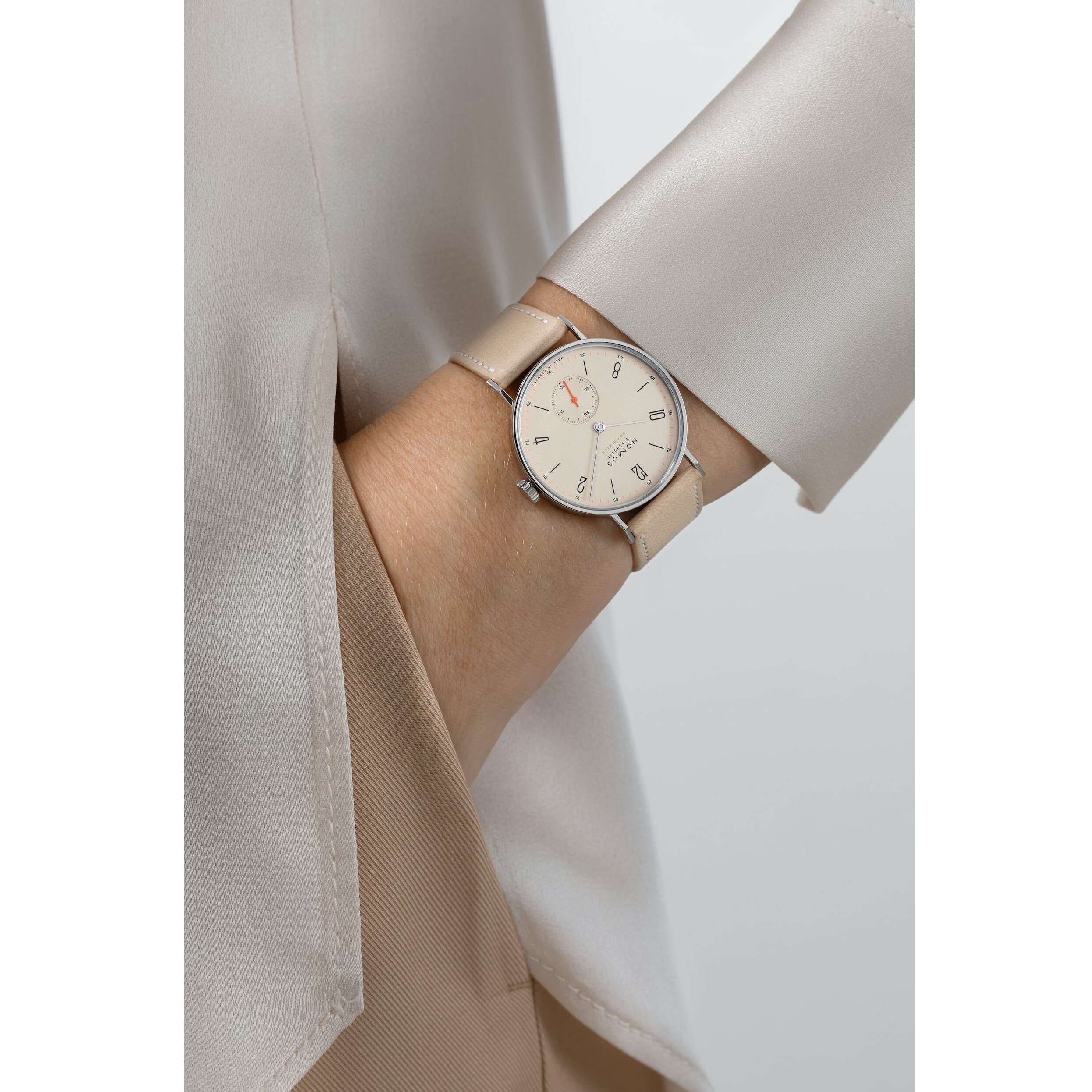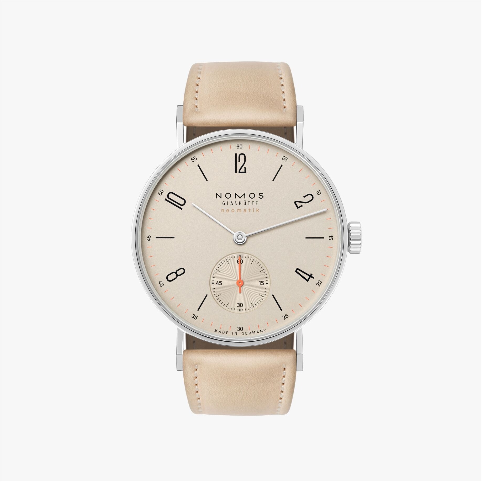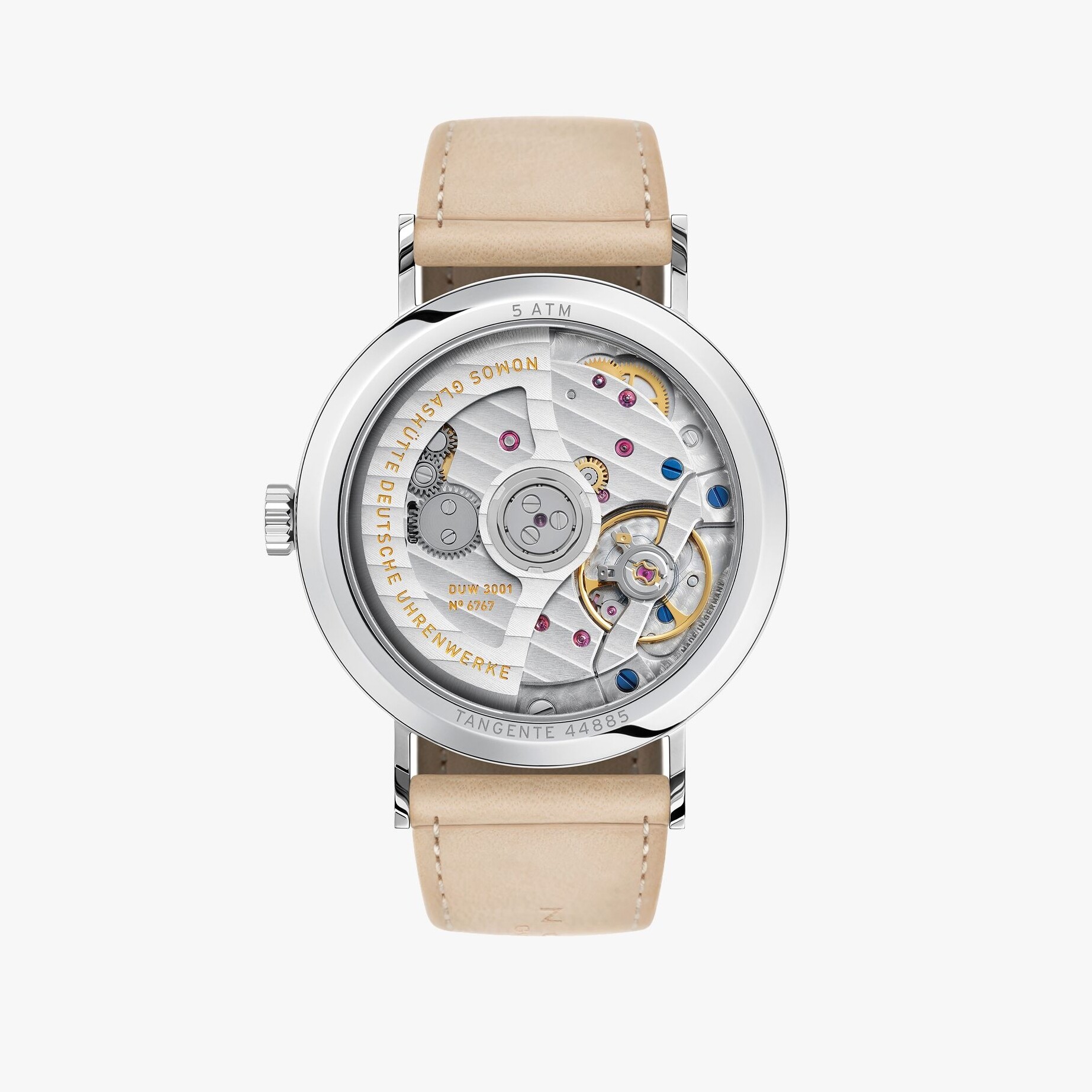 The NOMOS classic with the new NOMOS neomatik caliber is now automatic and yet strikingly slender. Here the watch is champagne-colored, while the minute markers in neon orange appear as delicate pops around the edge. On the automatic NOMOS caliber DUW 3001, clearly visible through the sapphire crystal glass: Glashütte ribbing, the three-quarter plate, NOMOS perlage.