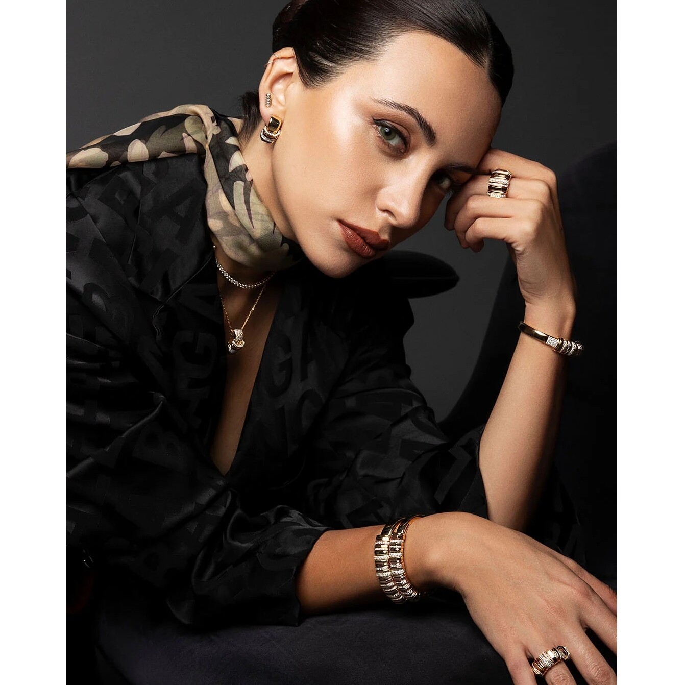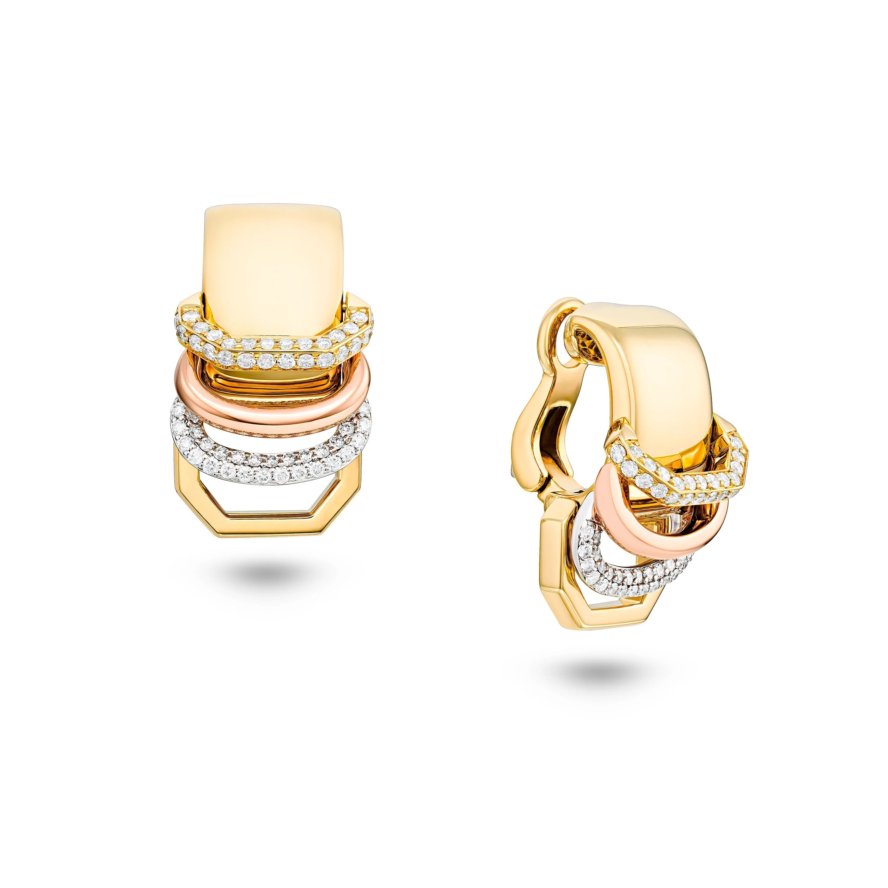 A sophisticated pair of earrings crafted in polished yellow gold, featuring interlocking rings in yellow, white, and rose gold. Accented with pavé-set diamonds, the design creates a soft, layered movement—like a whisper—combining shine, texture, and modern elegance in a refined statement piece.