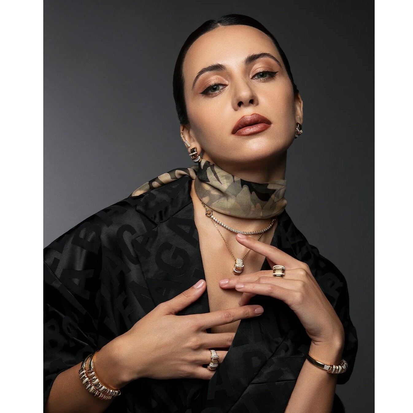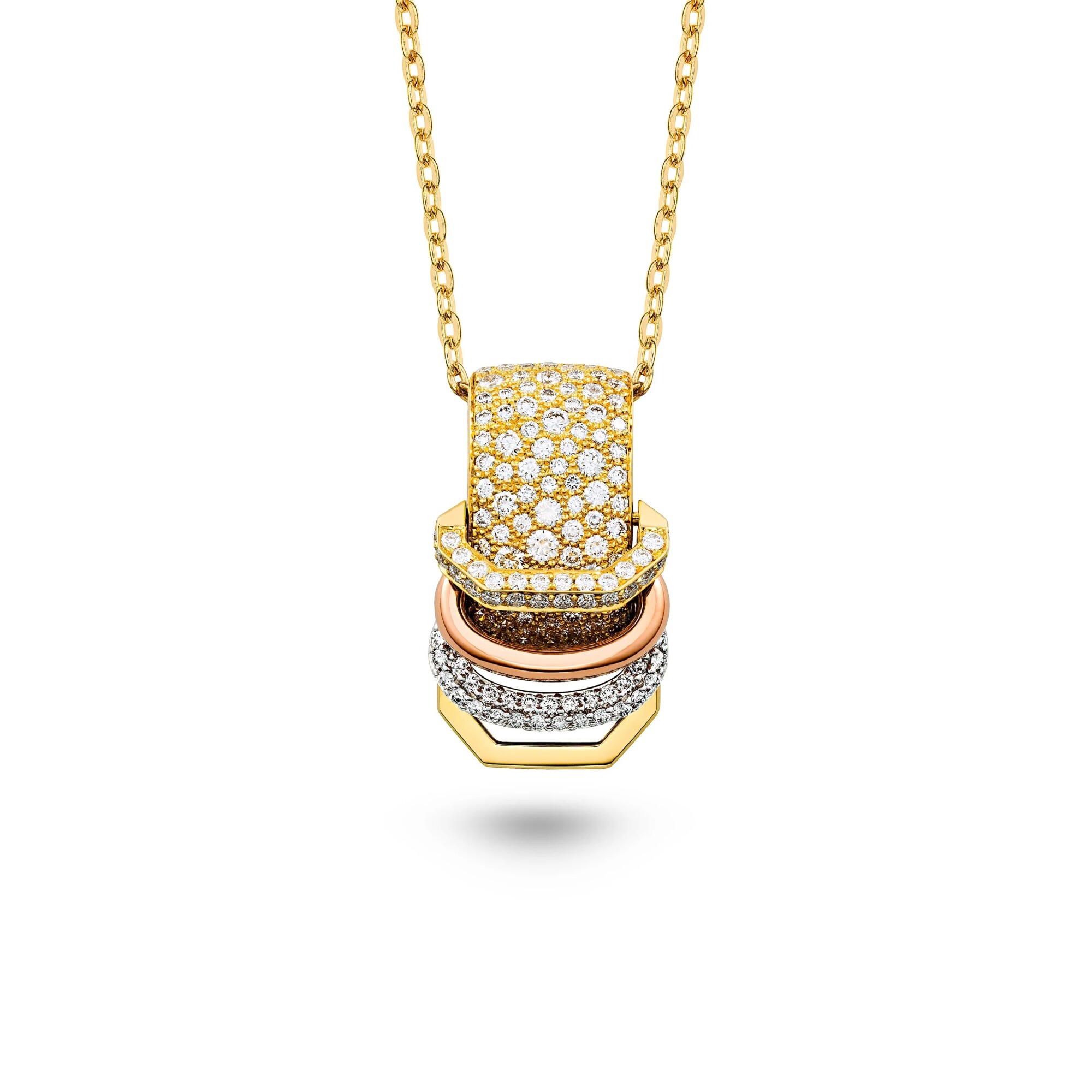 A modern tri-gold pendant featuring stacked yellow, rose, and white gold elements, each pavé-set with brilliant diamonds. A bold yet elegant design that adds refined sparkle to any look.