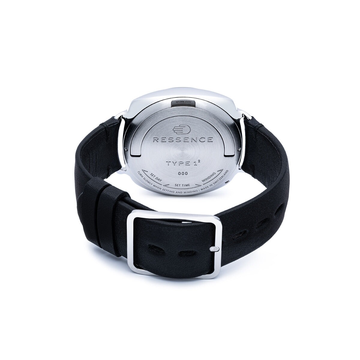 A modern cushion-shaped timepiece featuring a deep black dial with Ressence’s signature orbital display. Minimal, sophisticated, and effortlessly contemporary, it delivers refined elegance in a bold monochrome look.
