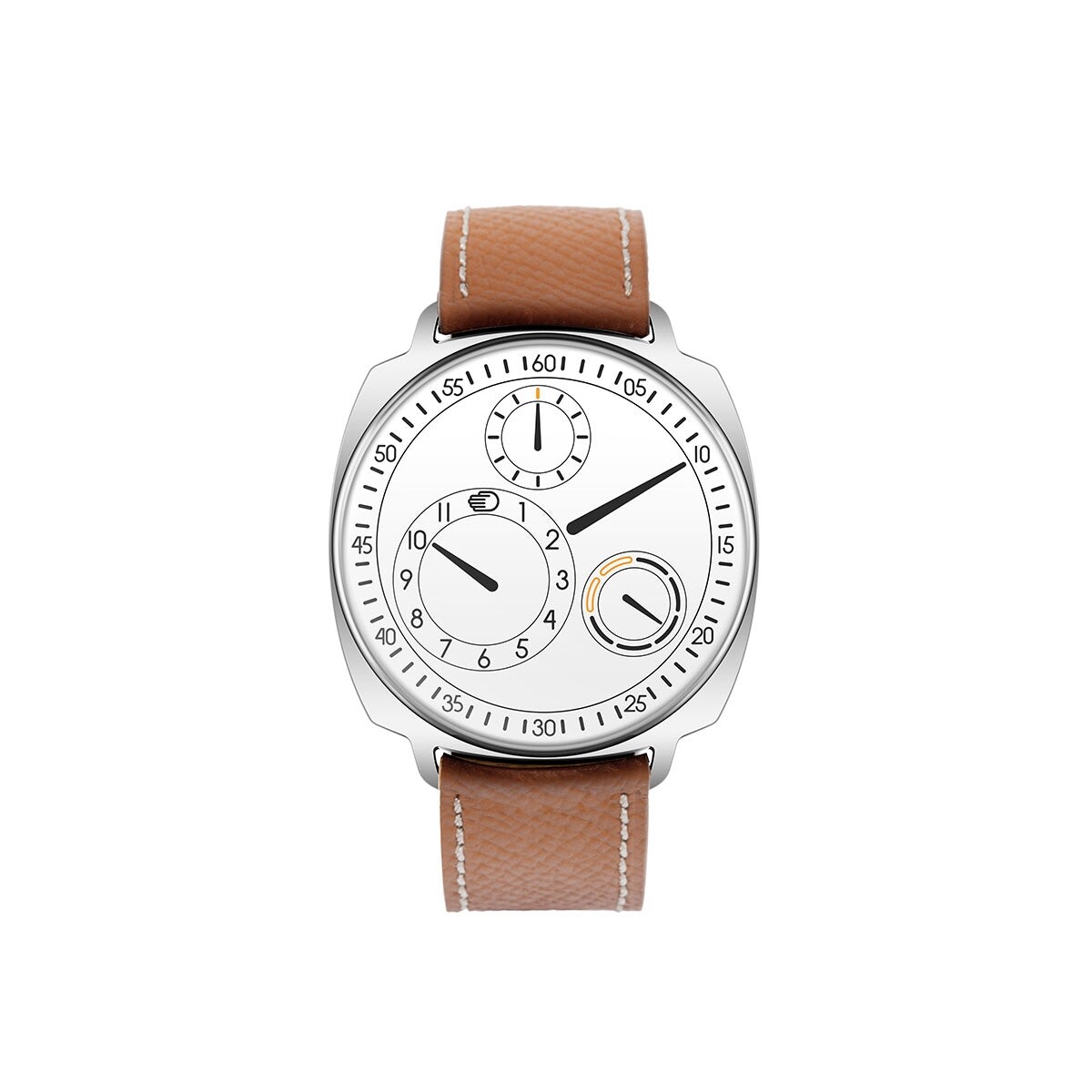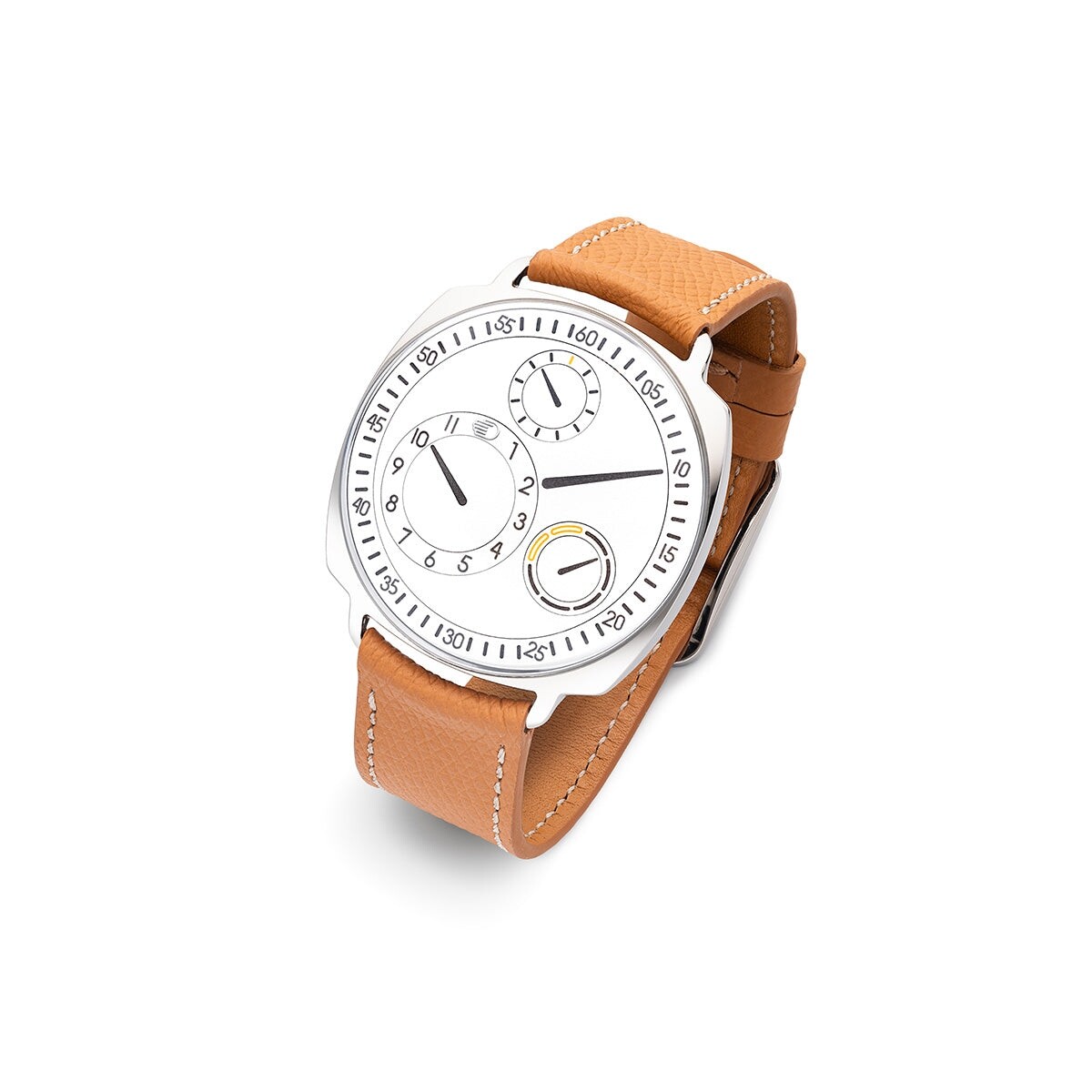 A sleek cushion-shaped watch with a crisp white dial and Ressence’s signature orbital display. Modern, minimalist, and ultra-refined, it brings a fresh, contemporary elegance to everyday wear.