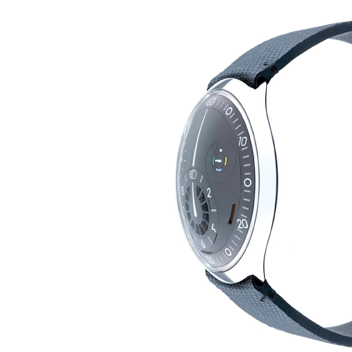 A modern titanium timepiece with a refined grey dial, featuring Ressence’s innovative e-Crown® technology for smart, self-setting timekeeping. Minimal, technical, and effortlessly contemporary, it represents the next generation of mechanical watchmaking.