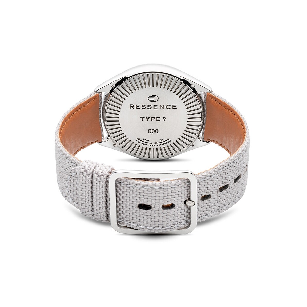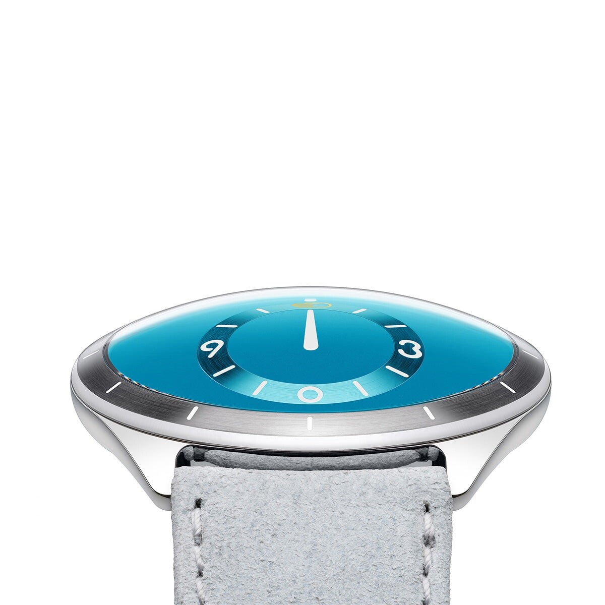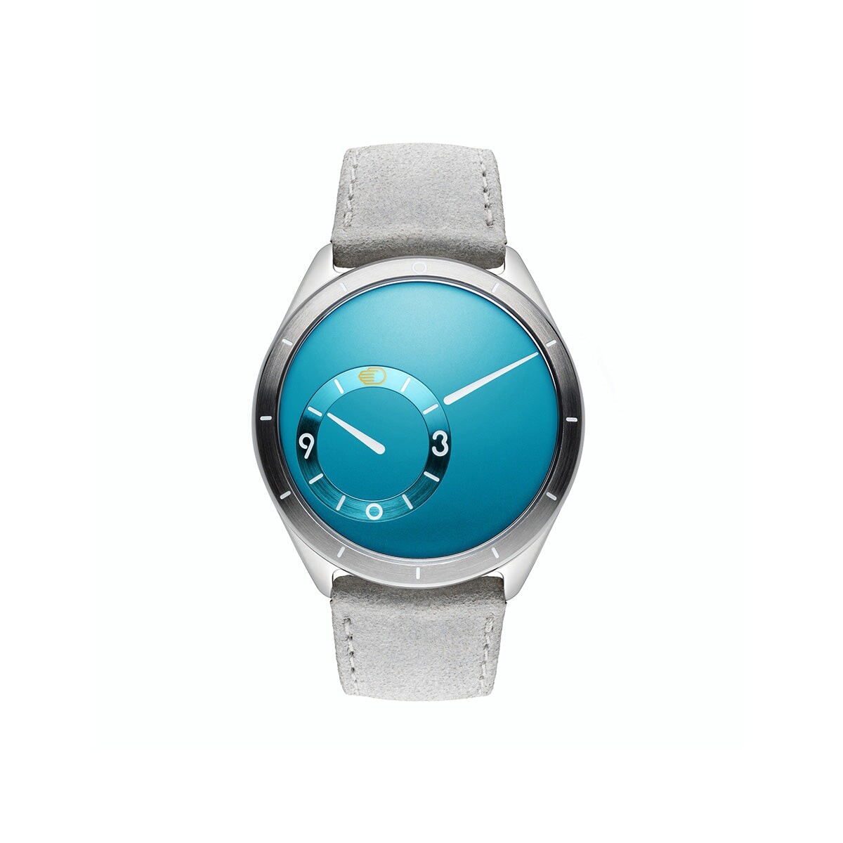 A sleek titanium timepiece featuring a fresh aqua-blue dial and Ressence’s signature orbital display. Ultra-light, minimalist, and intuitive, it blends contemporary design with refined mechanical innovation.